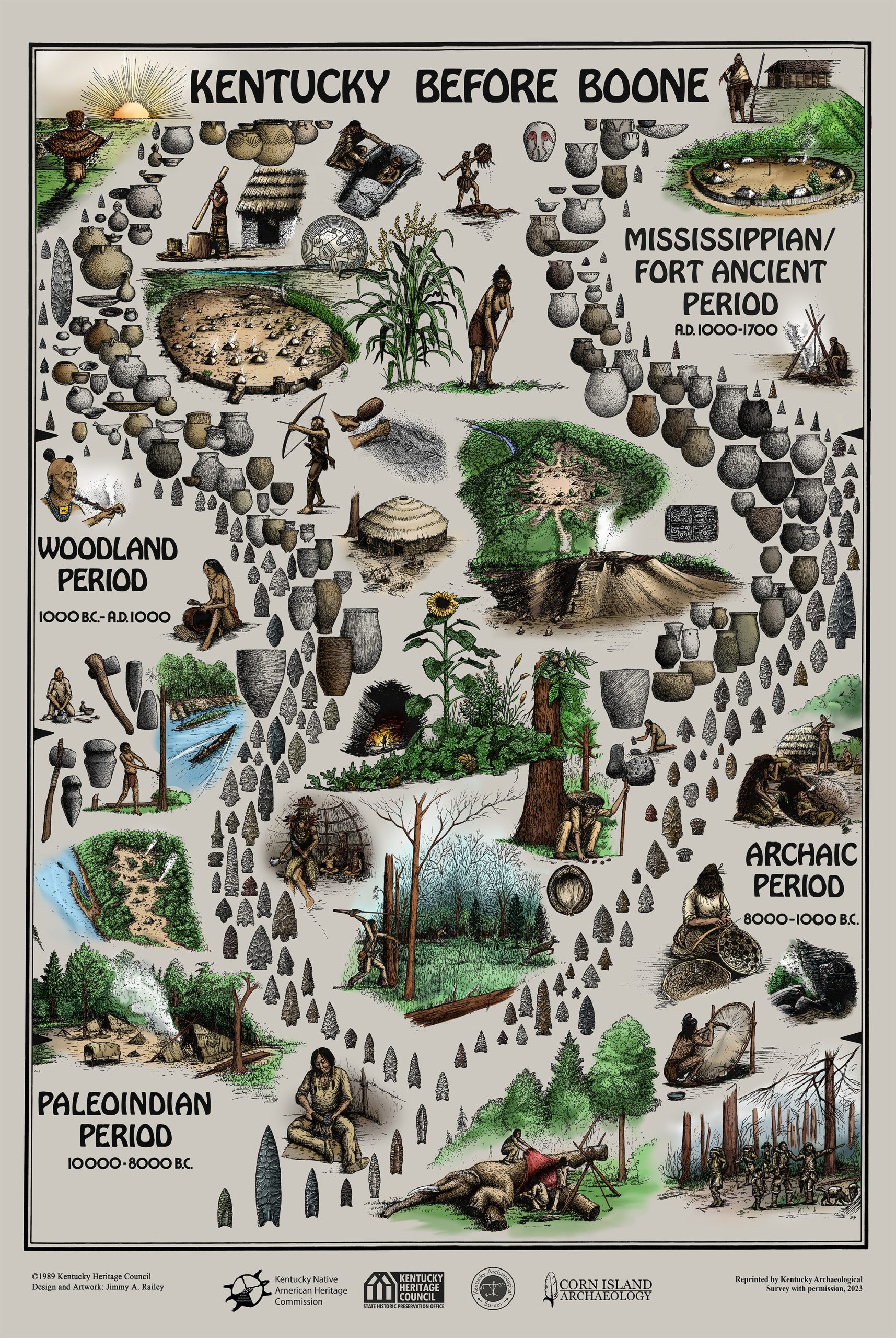 In 1989, the Kentucky Heritage Council printed Kentucky Before Boone, Jim Railey’s amazingly detailed and informative poster depicting Indigenous lifeways, technology, and diagnostic artifacts drawn from Kentucky archaeological sites and artifacts. This first printing was one color: buffalo brown ink on antique white paper. By 2010, the poster was out of print and remained so until 2023.